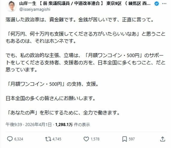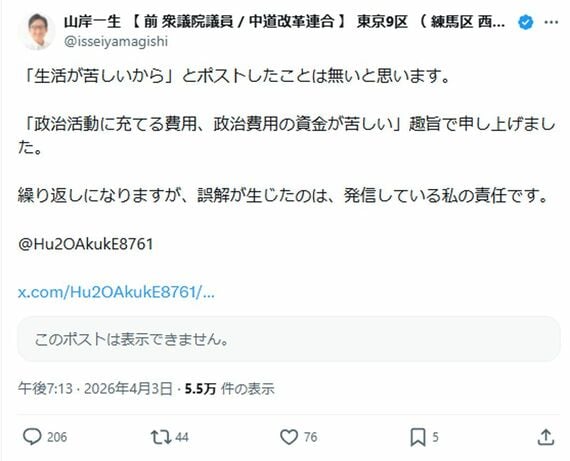 2月の衆院選で落選した中道改革連合の山岸一生元衆院議員のXのポストが大炎上している。