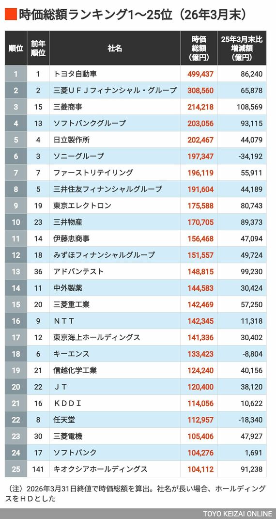 「時価総額が高い企業」ランキングTOP100 10兆円以上となったのは25社