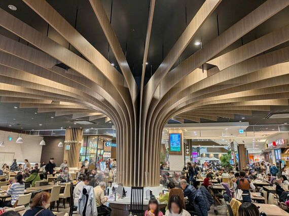 近年は緑を多く配置しているフードコートが増えてきたが、この森のキッチンコートは緑を置くだけでなく、コンセプト通り森や自然そのものを感じられる空間だ。