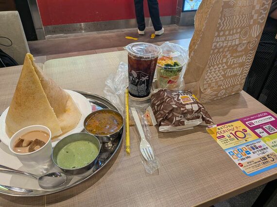 カレーっぽい見た目だが、ココナッツチャツネは冷たくて驚いた。辛いココナッツミルクという感じで、確かにドーサに合う。サンバールはインドのスープで、日本でいうとみそ汁的なもの。なので、ドーサをつけてもいいしそのままサンバールだけ食べてもいい。