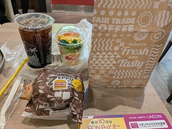 ゼッテリアで注文したのは、ダブル絶品チーズバーガーのセット。付け合わせはポテトなど揚げ物ではなく、サラダにしてみた。カップサラダを食べるのは、初めてかもしれない。気軽に野菜をとれるのはありがたい限りだ。