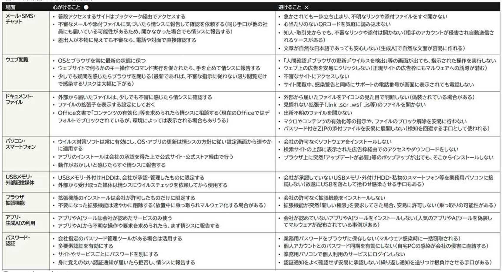 ◎ 図1 マルウェア感染を防ぐために一般社員が知っておくべきこと「日常業務で守るべき行動基準」