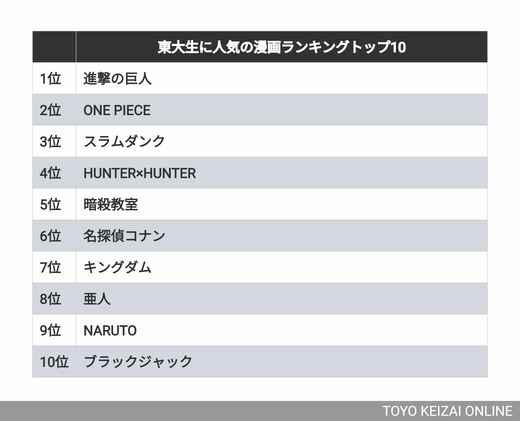 特に『スラムダンク』は、少し古い作品ながら3位にランクイン。やはり東大生人気が高い印象があります。