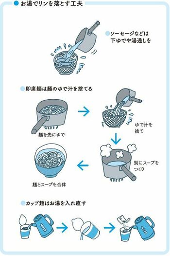 また、即席麺の場合は、麺とスープを別々に調理するのがおすすめ。麺を先にゆでて、ゆで上がったら麺をざるに取り、ゆで汁は捨てます。そのうえで、別につくって沸かしておいたスープにゆでた麺を合体させるのです。さらに、カップ麺の場合は、スープの素と麺が別々になっているタイプを選んで、麺にお湯を注いだ後、そのお湯をいったん捨てて、改めてお湯を入れ直す方法をとるといいでしょう。