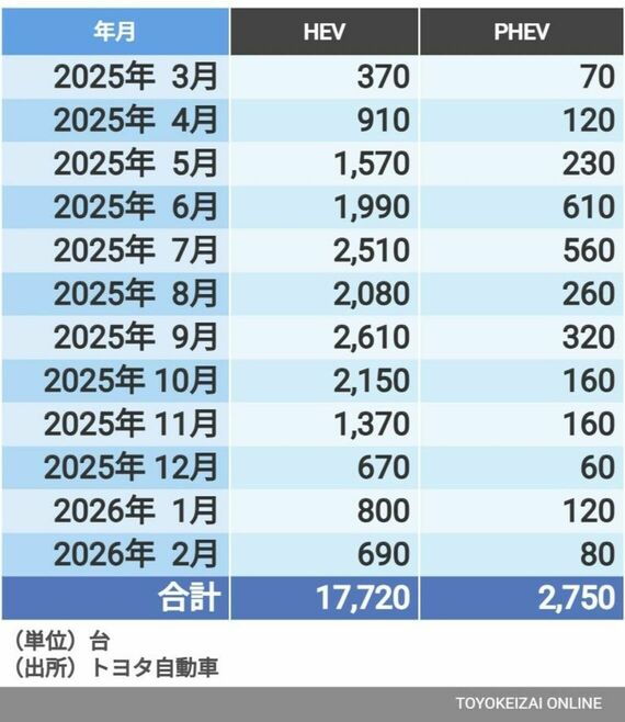 25年3月の発売時の販売目標は、月販500台のPHEVを含んだ全体で月販1500台であった。つまり、PHEVの販売こそ目標に届かなかったものの、12カ月で2万470台という実績は、目標を大きく上回るものであったのだ。