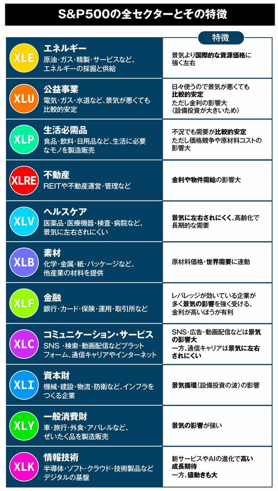 米国株の代表的な指数であるS&P500は、すべての企業が11の業種(セクター)に分類されている。例えば、IT企業が多い「情報技術」、銀行や保険会社を含む「金融」、電力やガスといった「公益事業」などだ。株式市場は、こうした性格の異なる業種の集まりでできている。