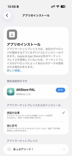 ここをタップすると、代替ストアのインストールをユーザー自身で承認できる。「許可」をタップするとインストールが開始される。また、ここで「アプリマーケットプレイスからのインストール」を「常に許可」にしておくと、以降は、設定からの許可というプロセスを踏まず、サイトから直接ダウンロードできるようになる。