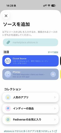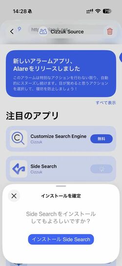 ソースは、ストア内ストアのようなもの。ここでは「推奨ソース」をタップして、「Cizzuk Source」というユーティリティアプリがそろうソースを追加した。このソース内には、Safariのサーチエンジンをカスタマイズする「Customize Search Engine」というアプリや、サイドキーで呼び出すAIアシスタントを変更する「Side Search」といったアプリが5つ配信されている。