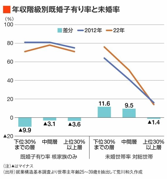 世帯年収の絶対額ではなく、年収階級で下位30%までの下位層、下位30%から上位30%までの中間層、上位30%以上の上位層の3つの階層に分けて、2012年から2022年にかけて、夫婦の子有率の変化と未婚単身世帯率の変化を見てみます。