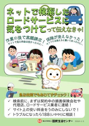 国民生活センターは26年2月、検索上位のロードサービスサイトに「基本料金2280円~」と表示されていたのに約8万円を請求された例や、「2980円~」をうたいながら6万6000円の見積もりを示し、断ると3万5000円のキャンセル料を求めた例を紹介しました。