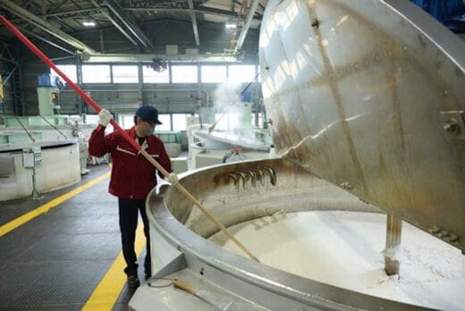 復活を遂げた「赤箱」だが、発売以来、昔ながらの「釜だき製法(けん化塩析法)」で製造し続けている。この製法は職人による手作業の工程があり、60トンの石けん釜を使って、約1週間かけて作っているそうだ。同じ量を約1日で作れる「連続中和法」という製法もあるが、同工場では採用していない。
