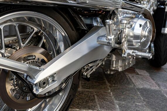 リヤ足まわりは、かつてのホンダワークスマシン「RC211V」のコンセプトに近く、サスペンション上部取付マウントをフレームに持たず、スイングアーム内で完結したデザイン。サスペンションストロークは130mm。スイングアームのピボットは通常のシャーシではなく、ビレットのクランクケースにデザインされており、リヤサスペンションへの入力のトルクロッドも同じくクランクケースからという、現代のワークスMotoGPマシンとなんら変わらない最新のデザインを採用しているから驚きだ。