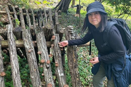 食事会場である「ごちそうの森」が見えてきた辺りの茂みが開けた場所で、「うちで栽培しているしいたけです。食べられるだけどうぞ」と、組んだ原木に生えたしいたけを採らせてくれました。