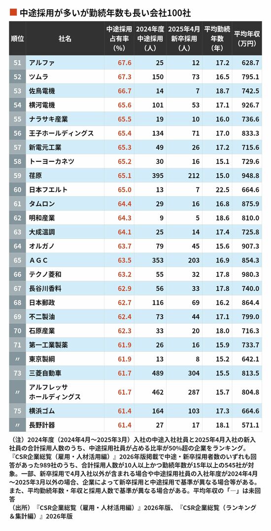 ビジネス #CSR企業総覧 前の記事 次の記事 中途採用が多いのに長く働ける会社トップ100 ランキング上位の意外な顔ぶれ 3分で読める 公開日時:2026/04/15 06:00 中途採用が多いのに長く働ける会社の特徴は?(写真:maroke/PIXTA) 山谷 明良 東洋経済データ事業局 フォロー 1/6 PAGES 2/6 PAGES 3/6 PAGES 4/6 PAGES 5/6 PAGES 51〜75位 次ページが続きます:【77〜100位】 6/6 PAGES