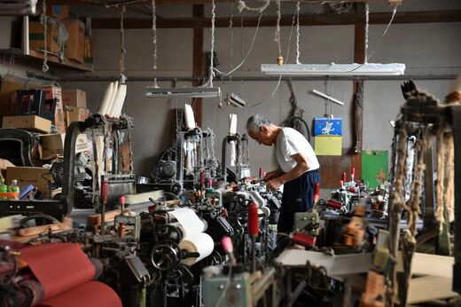 歯車を剥き出しにした織機は、牙をかみ合わせる獣のようだ。舟形の「シャトル」が細いヨコ糸を運びながら往復するたびに、ガシャン、ガシャンと音が鳴る。老夫婦2人が、少しでも距離感を間違えたら手をかみちぎられそうな機械の前に立ち、織物と向き合っている。