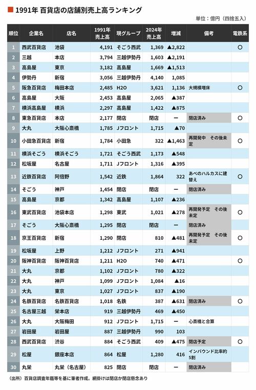 この頃の上位の顔ぶれは今でも大手百貨店の基幹店として残っている銘柄と大きな変化はないが、セゾングループの中核であった西武百貨店池袋本店が1位、次いで、大老舗の三越本店、日本橋高島屋と続く。現在の1、2位の伊勢丹本店、阪急梅田本店が4位、5位となっており、この30年ちょっとで順位が逆転していることがわかる。