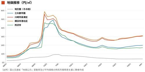 三大都市圏、地方、都内、田園都市線沿線(川崎市高津区)、所沢の地価の長期推移をみたのが、次の図表である。