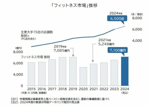当時はフィットネス市場が盛り上がっていた時期だ。帝国データバンクの調査によると市場規模は過去最高の7085億円を記録。7100億円を記録した2024年とだいたい同じ規模だが、店舗数は現在と比べて約60%しかなかった。つまり、2019年時点では24時間ジムの需要に供給が追いついていなかったと言える。