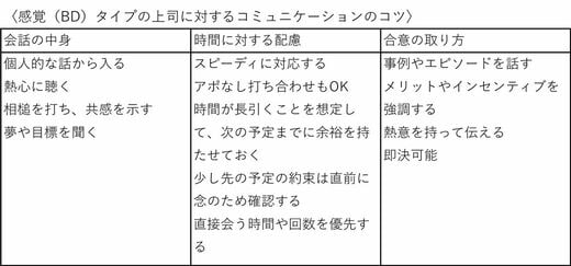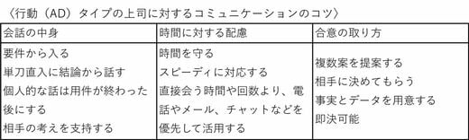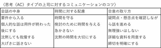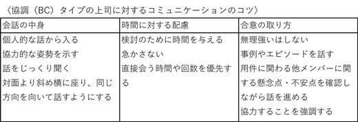「会話の中身」「時間に対する配慮」「合意の取り方」の3つの観点で表にまとめました。上司のソーシャルスタイルに合わせて、ぜひ試してみてください。
