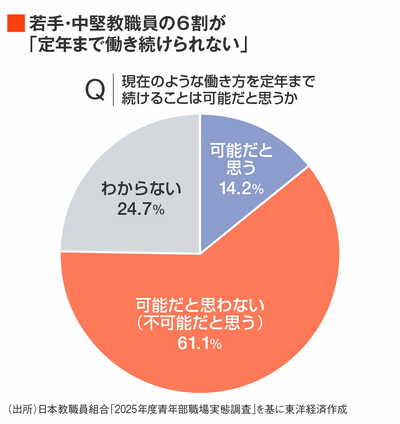 こうした過酷な実態を反映し、日教組の「2025年度青年部職場実態調査」では、61.1%の教職員が「現在のような働き方を定年まで続けることは可能だと思わない」と回答した。