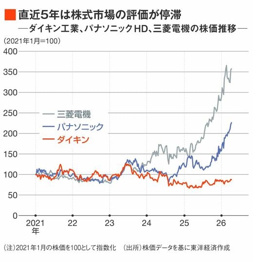 ダイキンの株価はこの5年間停滞している。三菱電機やパナソニックホールディングス(HD)など、国内で空調機を手がける同業と比較してもパフォーマンスが悪い。三菱電機には防衛費の増額、パナHDにはデータセンター向け電池電源の需要増など追い風が吹いていたことを差し引いても、ダイキン株の停滞が目立つ(下図)。