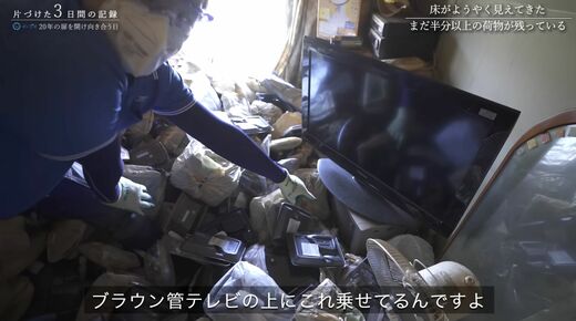 ゴミに埋もれたブラウン管テレビの上に、薄型テレビが置かれていた。布団も同様で、ゴミの上に新しい布団を敷き、それが埋まればまた次を買う。そうして何枚もの布団が重なり合っていた。