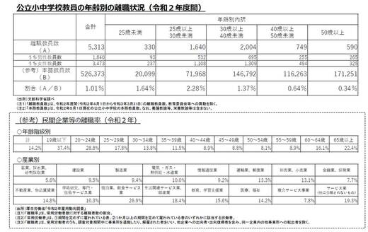 少し前のデータとはなるが、2020年度の状況でみると、25歳未満の教員(公立小中学校)の離職率は1.64%、25歳以上30歳未満でも2.28%に過ぎない。3年以内の離職率も1.47%である。