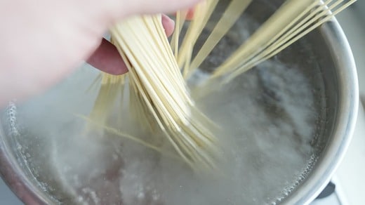 鍋に湯を沸かし、棒ラーメンをゆでます。ゆで時間は3分。かんすいの香りを飛ばすため、強めに沸騰させたたっぷりの湯でゆでるのがコツです。