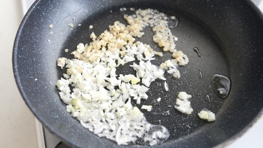 フライパンにサラダ油とショウガ、ネギのみじん切りを入れ、中火で香りが立つまで炒めます。甘い香りに仕上げるために、焦がさないようにするのがポイントです。