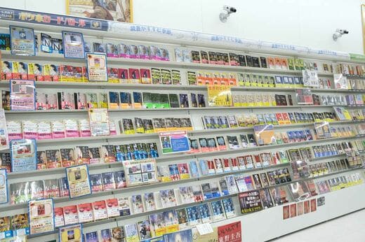 ジャンルごとに棚が延々と続く。漫画の全巻セットや赤本、大型のイラスト集、専門性のある棚も充実している。大掛かりなフェアもあれば、小さなコーナーもあり、つい足が止まる。
