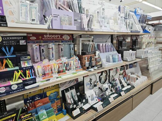 定番の筆記具から、勉強グッズ、アイデア文具、高級な万年筆まで、展開は幅広い。鳩居堂や伊東屋の商品、輸入文具、革製品、絵の具類、キャラクターアイテムやゲーム、バッグ類も並んでいる。