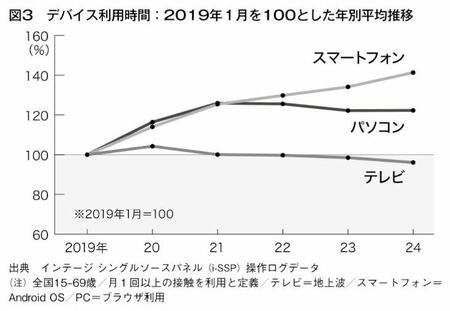 こうしたデバイスごとの傾向を踏まえつつ、さらにメディアの利用状況を見ていきましょう。続いて、i-SSPの操作ログデータから、生活者が1日あたりどの程度各デバイスを利用しているのかを見ます。図2は、19年以降の1人あたり利用時間(分)の推移です。