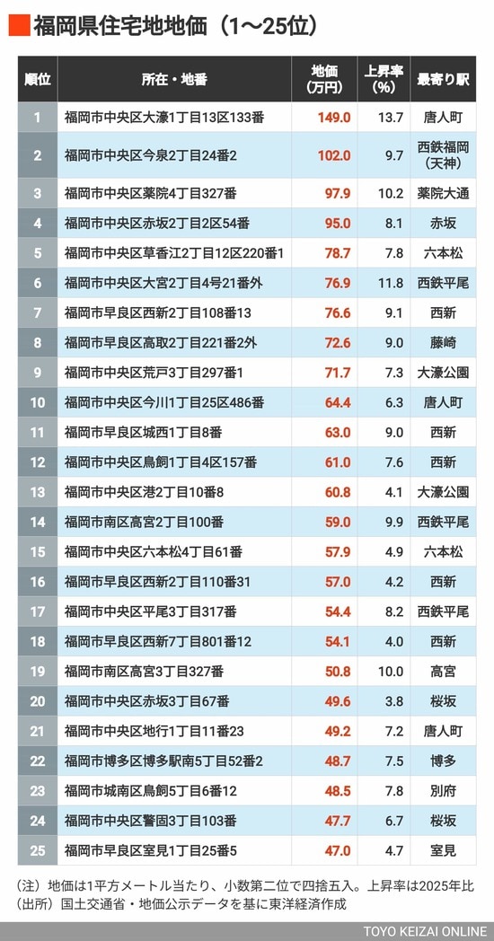 ライフ 【2026年版】地価が高い「福岡県の住宅地」ランキングTOP305地点 3位は薬院大通、2位が天神、では1位だったのはどの地点? 2分で読める 公開日時:2026/04/20 07:30 地価が高い福岡県の住宅地「11~17位」の地点がこちら(画像:編集部作成) 東洋経済オンライン編集部 フォロー 1/13 PAGES 2/13 PAGES 次ページが続きます:【続いて26~50位】 3/13 PAGES 4/13 PAGES 5/13 PAGES 6/13 PAGES 7/13 PAGES 8/13 PAGES 9/13 PAGES 10/13 PAGES 11/13 PAGES 12/13 PAGES 13/13 PAGES