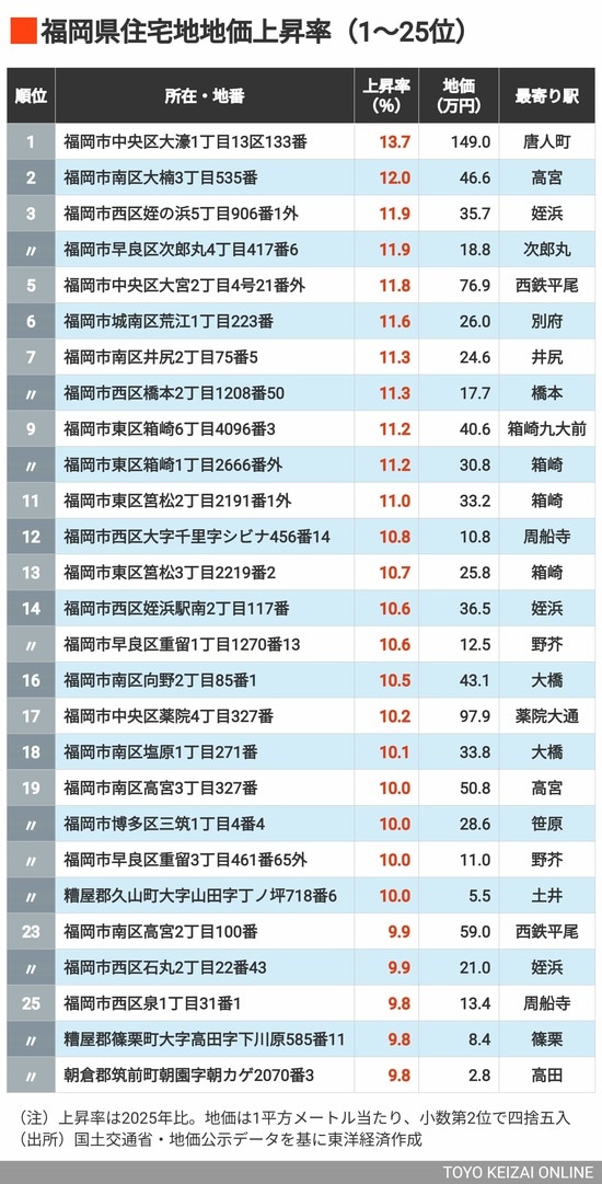 ライフ 【2026年版】「福岡県の住宅地」地価上昇率ランキングTOP300地点 3位は姪浜&次郎丸、2位が高宮、では1位の地点は? 2分で読める 公開日時:2026/04/21 06:30 地価上昇率が高い福岡県の住宅地「11~17位」の地点がこちら(画像:編集部作成) 東洋経済オンライン編集部 フォロー 1/13 PAGES 2/13 PAGES 次ページが続きます:【続いて28~50位】 3/13 PAGES 4/13 PAGES 5/13 PAGES 6/13 PAGES 7/13 PAGES 8/13 PAGES 9/13 PAGES 10/13 PAGES 11/13 PAGES 12/13 PAGES 13/13 PAGES