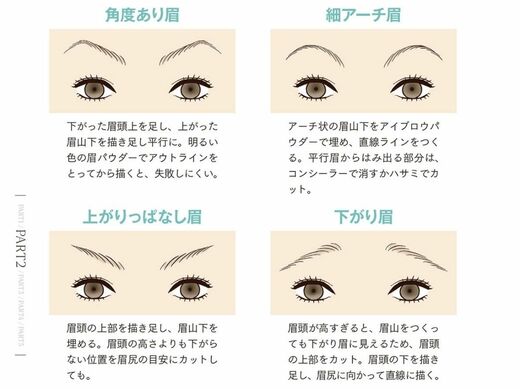 よく髪は顔の額縁と言われますが、眉毛は目の額縁です。その形次第で目の印象が大きく変わります。上のイラストをご覧いただくと、目は全て同じですが眉が違うだけで、怒って見えたり、困って見えたり、表情まで変えて見せます。