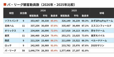 セ・リーグと同様、開幕から4月19日までの観客動員について、昨年の同じ試合数を消化した時点と比較しよう。地方球場で開催された試合は除く。