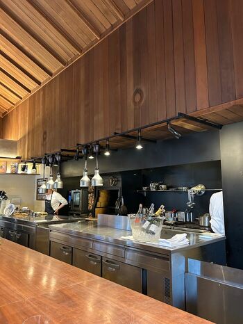 かつて瀧波の大浴場だった建物がオープンキッチンとなり、薪窯が鎮座する。料理は置賜盆地をはじめ、山形県産の食材でまとめたコース。原田シェフは置賜盆地の寒暖差とそれゆえに生み出される食材の質の高さを強調する。真打ちはやはり米沢牛である。