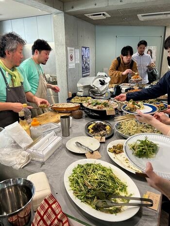 この日も日本各地から店が出店。鶴岡のイタリアン「gira e gira(ジーラ ジーラ)」と、ナチュラルワインで知られる山形市の「プルピエ」によるビュッフェにはひたすら行列ができていた。昨日訪れたひつじやも出店しており、ひつじやで隣で食べていた岡山の方にも再会する。回遊するところはほぼ固定されているのだろう。