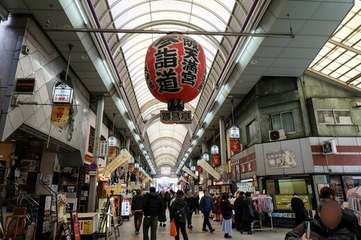 目を引くのが「天満の天神さん」と親しまれる大阪天満宮の参詣道を示す巨大な大提灯だ。江戸時代から大阪天満宮の門前には多くの青物商が軒を連ね、明治時代には早くも現在の商店街の姿に近い構造になっていたという。つまり天神橋筋商店街のルーツは、この提灯の下にあるのだ。