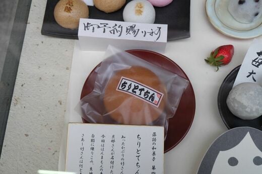てんさんには地元銘菓がある。それが和菓子の店「薫々堂(くんくんどう)」のどら焼き「ちりとてちん」。リズミカルな商品名は「知ったかぶりばかりするイヤミな隣人に対し、腐った豆腐を架空の長崎名産『ちりとてちん』だと騙して食べさせる」という落語のストーリーを引用したもの。