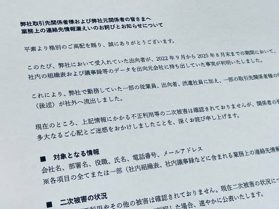 そもそもトヨタは2025年10月、「弊社取引先関係者様および弊社元関係者の皆さまへ」と題した文書で、「弊社において受入れていた出向者が、2022年9月から2025年8月末までの期間において、社内の組織表および議事録等のデータを出向元会社に持ち出していた事実が判明しました」と公表している。