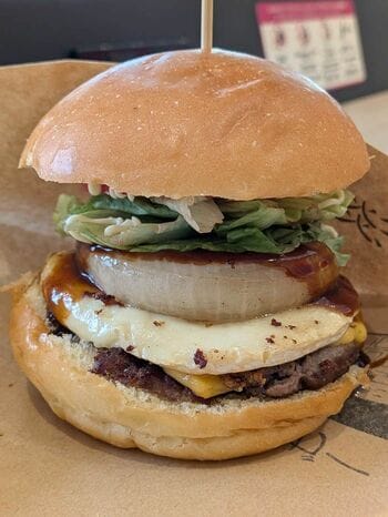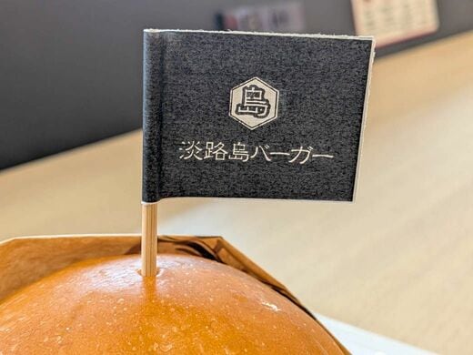 淡路島バーガーは見た目のインパクト十分。下からパテ、チーズ、たまねぎ、レタス、あとは隠れているが最上部にトマトもある。