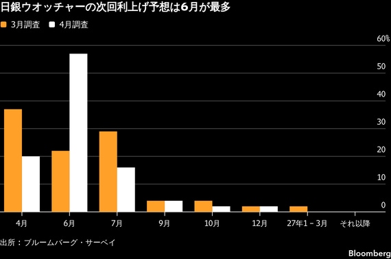 ブルームバーグがエコノミスト51人を対象に15-20日に行った調査によると、政策金利の無担保コール翌日物金利を現在の0.75%程度から引き上げる時期について、最多の55%が6月会合を予想した。3月調査で37%と最も多かった4月会合は20%に減少。全体の88%が7月会合までの追加利上げを見込んでいる。