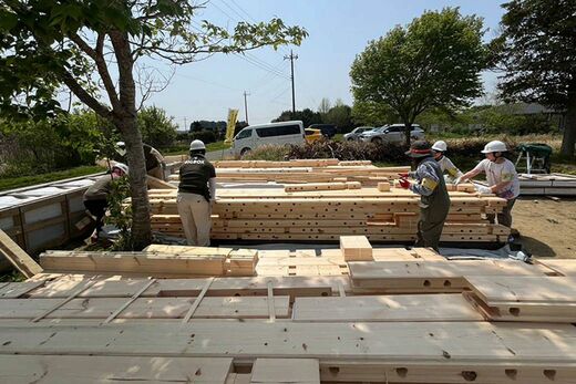 「ただ積み上げるだけじゃなくて、その間にダボ(木杭)を入れるんです。その打ち方はスクールで教えてもらいました。釘は使いません」