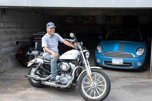 「車庫の中にバイク3台と車。ハーレー883とウルトラの3輪。空モン好きはバイカーが多いんですよ。こないだもラジコンクラブのメンバー5人で新潟へツーリングに行きました」