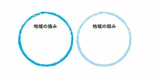 こうした難易度の高い「正解のない問い」に直面したときは、図のように、左の〇に「地域の強み」、右の〇に「地域の弱み」と書いてみましょう。