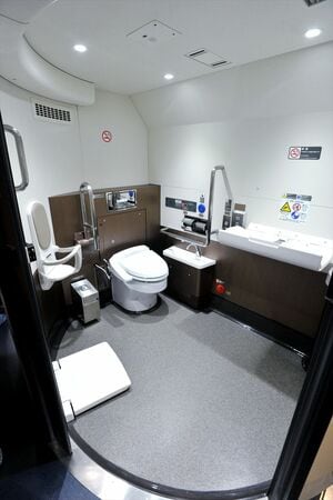 JR東日本の新幹線も、東北新幹線のE5系(北海道新幹線H5系)・E2系(どちらも10両編成)は奇数号車にトイレを配置している。設置位置は新青森・新函館北斗寄りの車両端だ。E2系は車いす対応トイレは9号車の1カ所だが、E5系は5号車にもある。その分女性用個室は1つ少ない。