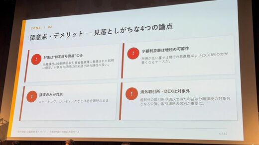 「分離課税にするというのは、国策として優遇するということ。ならば、国策として優遇すべき暗号資産とは何か、という考え方になる」。税理士の八木橋氏はそう背景を説く。無差別にすべての銘柄に恩恵を与えるわけにはいかない、という論理だ。