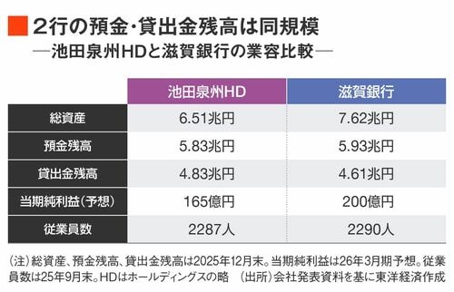 池田泉州HDは総資産が6.5兆円で、預金残高は5.8兆円。それに対して滋賀銀行は総資産7.6兆円、預金残高5.9兆円。規模が近い地方銀行による新たな資本業務提携が近畿圏でスタートする。