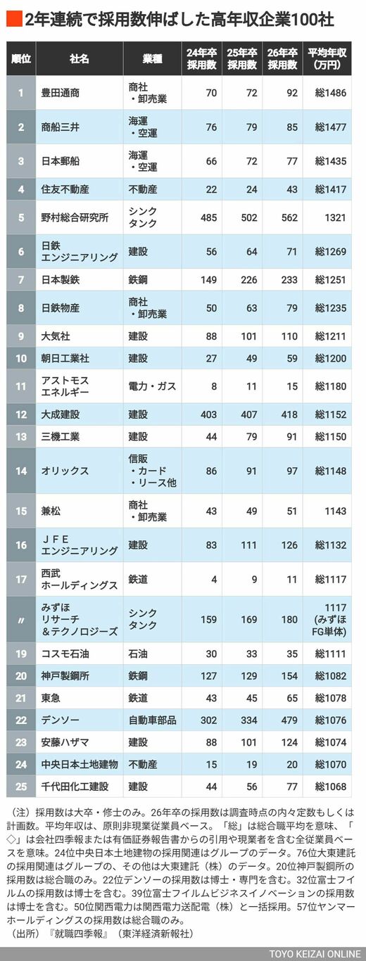 キャリア・教育 #就職四季報プラスワン 前の記事 次の記事 2年連続で「採用数が拡大」した"年収の高い企業"TOP100社 1位は20人増やした平均年収1486万円の"専門商社" 2分で読める 公開日時:2026/04/28 05:00 2年連続で採用数を伸ばした高年収企業100社をランキング形式で紹介。注目の1位は? 丹羽 夏海 東洋経済『就職四季報』編集部 フォロー 1/5 PAGES 2/5 PAGES 1~25位は? 次ページが続きます:【まだまだ続く平均年収1000万円超企業】 3/5 PAGES 4/5 PAGES 5/5 PAGES